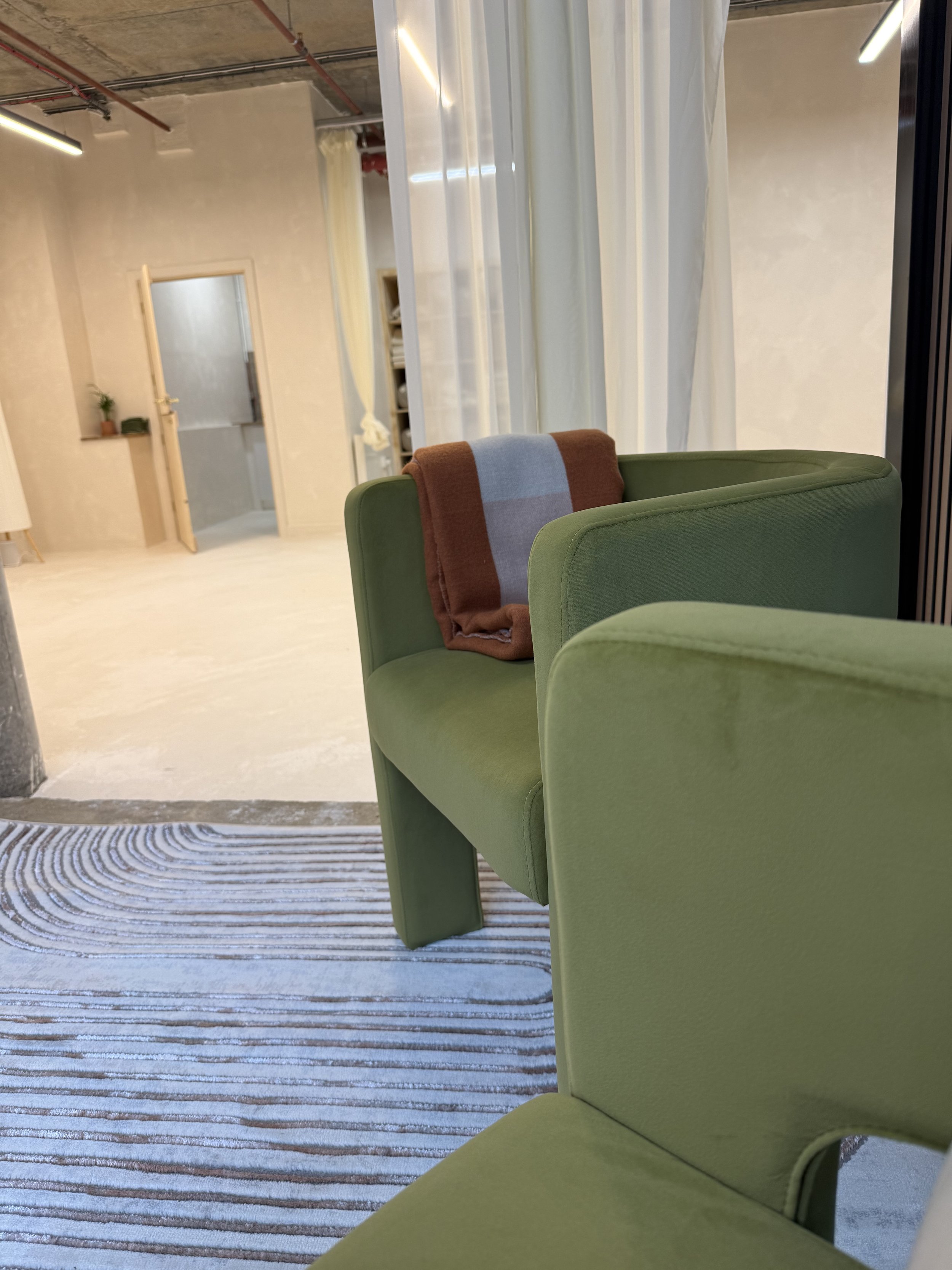 Greenery is dotted around, with a swirl patterned rug and two olive green velvet chairs in reception. We wanted to keep the colours consistent with our branding and so we ensured green was dominant, followed by terracotta and orange, and finally met with pops of violet (such as the coat hooks and painting).